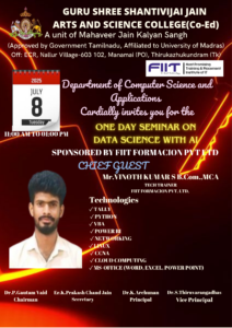 The Departments of Computer Science and Computer Application organized a One Day Seminar on “Data Science with AI” on 8th July 2025, from 11:00 AM to 1:00 PM at Guru Shree Shantivijai Jain Arts and Science College (Co-Ed).