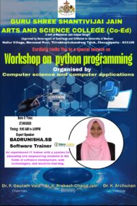 The Departments of Computer Science and Computer Application of Guru Shree Shantivijai Jain Arts and Science College (Co-Ed) organized a Workshop on Python Programming on 27th September 2025 from 9:00 AM to 1:00 PM.